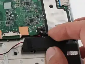 Отсоедините чёрный скомпонованный кабель динамиков от разъёма на материнской плате.