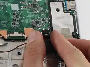 Отсоедините ZIF (разъём с нулевым усилием вставки) для порта USB, который частично закрывает левый динамик.