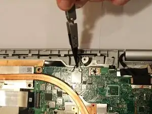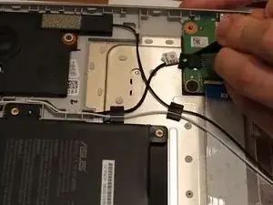 Используя пинцет с нейлоновыми наконечниками, аккуратно подденьте черные и белые провода от беспроводной карты и поднимите.