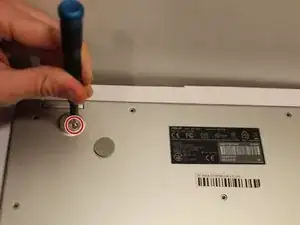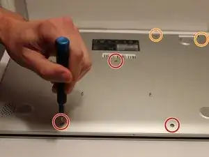 Удалите четыре винта JIS #00 размером 0,5 мм с нижнего края Chromebook и один в центре.