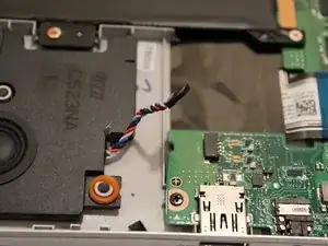 Используйте лопатку, чтобы поддеть черный провод от аудиовыхода, отодвигая провод в сторону левого динамика.