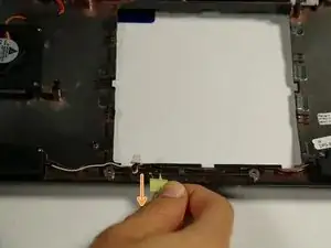 Материнская плата все еще будет подключена к экрану черными и белыми проводами у верхнего левого угла. Удалите беспроводную сетевую карту с материнской платы для полного отсоединения.