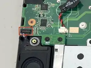Чтобы отсоединить кабель динамиков, попробуйте надавливать поочерёдно на стороны разъёма, как на небольших скользящих разъёмах.