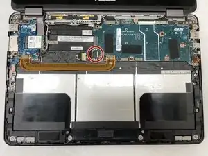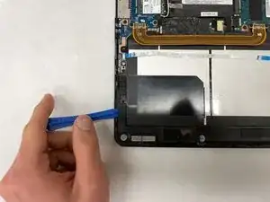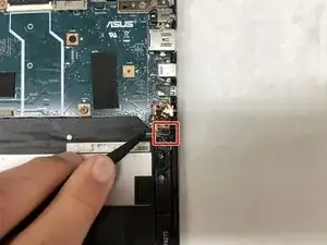 Используйте пластиковый инструмент для вскрытия, чтобы отсоединить ленточный кабель клавиатуры с ZIF-разъёмом от материнской платы.