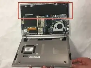 Осторожно снимите заднюю панель с ноутбука и найдите батарею и динамики в верхней части.