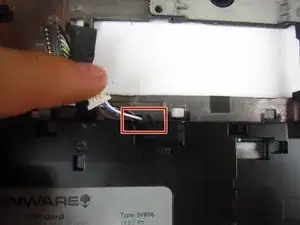 Поднимите защёлку разъёма и отключите кабель платы кнопки питания от системной платы. Идентифицирован как кабель с синей биркой.