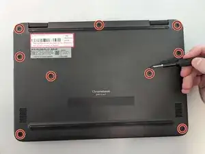 Удалите девять винтов длиной 4 мм с задней крышки ноутбука, используя отвертку Phillips #00.