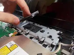 После того как все винты из серебряной панели и дна ноутбука будут удалены, аккуратно снимите серебряную панель, которая прикреплена к серебристому пластику сверху, с ноутбука.