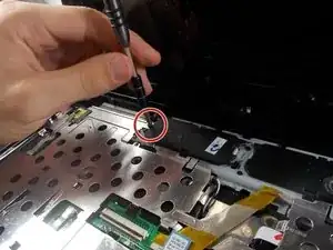 Удалите винты размером 6 мм, расположенные в серебряной металлической панели под клавиатурой.