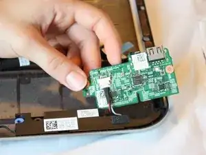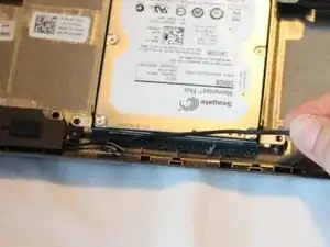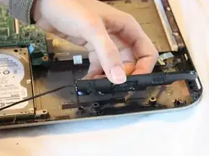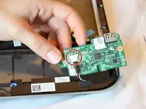 Отключите чёрный кабель от белого разъёма, вытащив провод динамика с дочерней платы.