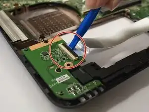 Аккуратно отсоедините ленточный кабель, подняв зажим, удерживающий кабель, с помощью пластикового инструмента. Отложите клавиатуру и ленточный кабель в сторону.