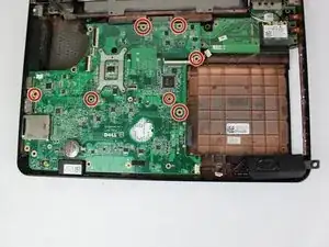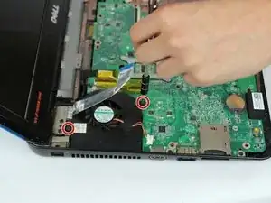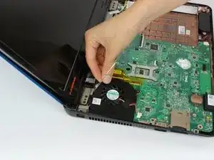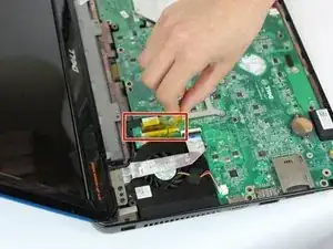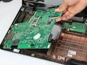 Материнская плата теперь может быть извлечена: потяните её вверх и наклоните влево до освобождения разъёмов от корпуса ноутбука.