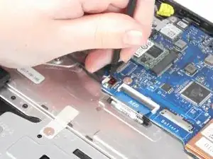 Используйте плоский конец лопатки, чтобы вытолкнуть белый пластиковый разъём динамика из его разъёма на материнской плате.