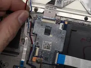 Используйте язычок на разъёме аккумулятора, чтобы осторожно поднять разъём вверх от его гнезда на материнской плате и отключить его.
