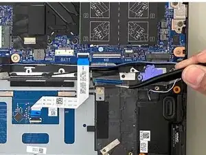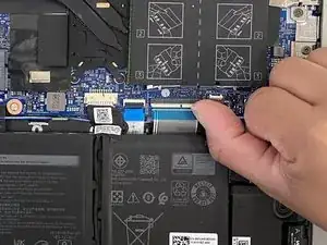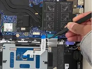 Аккуратно потяните за тонкий синий кабель пинцетом, чтобы отключить его.