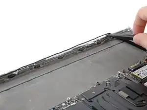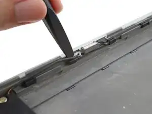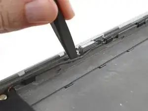 Кабель динамиков проложен вдоль нижнего края ноутбука. В следующих трёх шагах показано, как его отщёлкнуть.