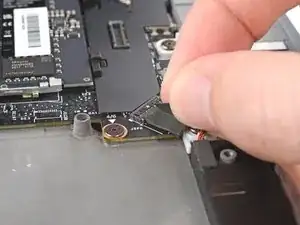 Поднимите язычок, чтобы отключить разъём батареи.