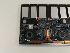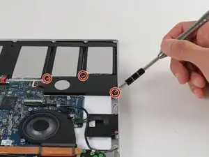 Снимите три красных винта Phillips #00 длиной 4.5 мм с динамика на правой стороне материнской платы.