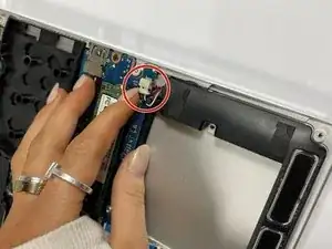 Используйте пластиковую лопаточку, чтобы аккуратно отсоединить разъём батареи от его гнезда, медленно поднимая разъём с каждой стороны до полного освобождения.