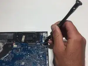 С помощью отвертки Philips #0 отвинтите последний винт, фиксирующий аккумулятор, расположенный у накопителя SSD.