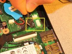 Найдите чёрную и белую планку, соединяющую ленточный кабель тачпада с материнской платой.