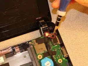 Удалите винт 4,9 мм, расположенный справа от слота карты памяти, используя отвертку PH1.