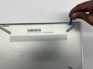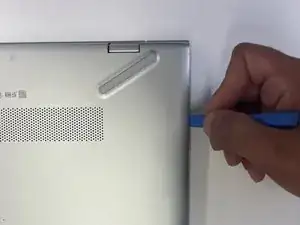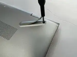 Каждый из этих винтов скрыт под двумя резиновыми ножками на задней стороне ноутбука (вблизи петель дисплея). Нет необходимости полностью снимать резиновые ножки; просто приподнимите верхнюю часть ножки, чтобы открыть винт.