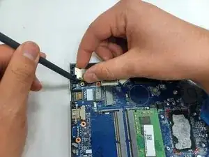 Снимите разъем питания (гнездовой) — поднимите его вверх с помощью черной лопатки.