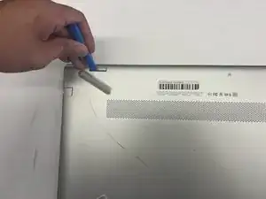 Вставьте инструмент для вскрытия в щель между петлями дисплея и нижней крышкой.