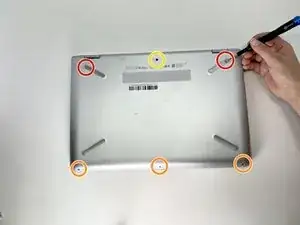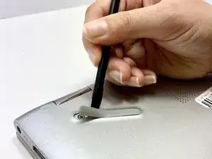 Снимите верхние левые и правые резиновые накладки, расположенные ближе к шарниру экрана, используя пластиковую лопатку для доступа к винтам под ними.