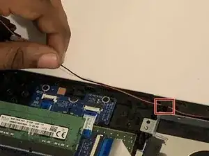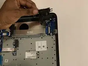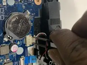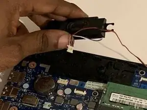 С помощью пинцета отсоедините левый динамик от материнской платы.