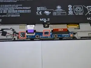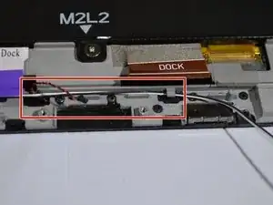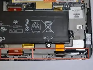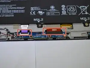 Удалите две ленты с надписью «Dock» в верхней части платы док-станции с помощью пинцета или прочного пластмассового инструмента для вскрытия.