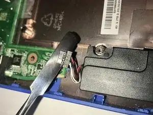Используя инструмент для открытия iFixit, удалите провода, соединяющие динамики с материнской платой, подняв указанный элемент вверх.
