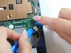 Используйте два инструмента для вскрытия или ногти, чтобы аккуратно «проводить» разъём динамика прямо из его гнезда на материнской плате.