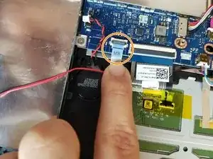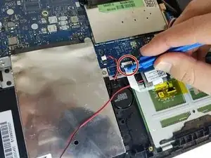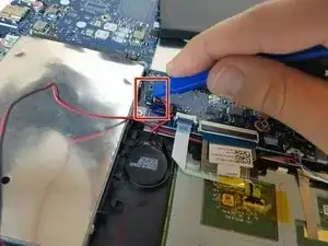 Отключите разъём аккумулятора, используя пластиковый инструмент для поддевания или пальцы, подтолкнув кабель вправо по направлению к аккумулятору.