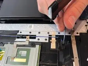 Размотайте провод динамика из пластиковых скоб. После полного разматывания провода используйте два синих инструмента iFixit, чтобы отключить чип динамика от материнской платы.
