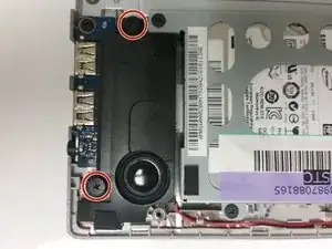 Удалите два винта Phillips #1 длиной 8 мм, удерживающие левый динамик.
