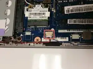 Пальцами отсоедините большой разъем, соединяющий клавиатуру с центром ноутбука, выдвинув конец плоского кабеля из гнезда.