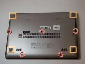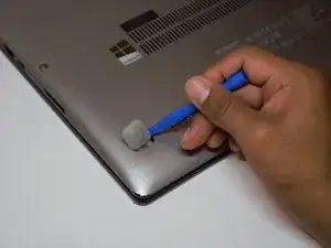 Отогните резиновые зажимы из уголков задней стороны ноутбука, чтобы открыть доступ к винтам.