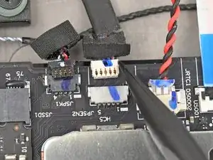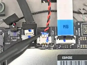 Используйте чистый ноготь или плоский конец лопатки, чтобы приподнять запирающий язычок разъёма кабеля считывателя смарт‑карт, обозначенного «JSC1».