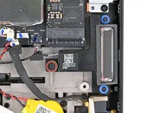Поднимите один из динамиков с посадочного штыря и проведите кабель динамика через зажимы в центре ноутбука.