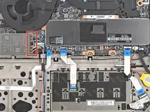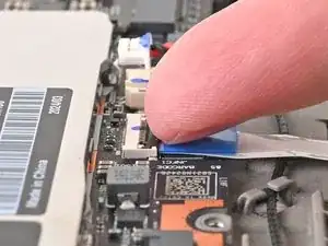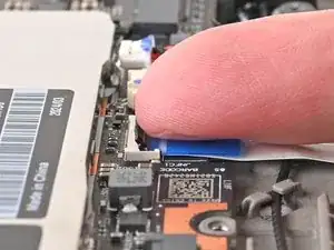 Используйте чистый ноготь или плоский конец лопатки, чтобы приподнять запирающий язычок разъёма кабеля тачпада, обозначенного «JCP1».