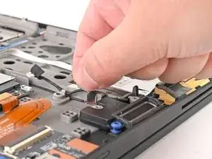 Схватите ногтями разъём правого динамика за кромку у задней части и аккуратно потяните разъём из гнезда (обозначено «JSPK1»).