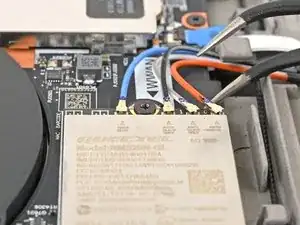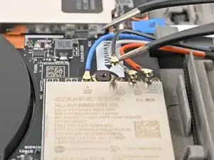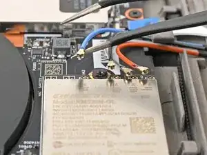 Просуньте одно плечо изогнутого пинцета под металлическую шейку одного из коаксиальных разъёмов антенны на плате WWAN и поднимите строго вверх, чтобы отсоединить его.