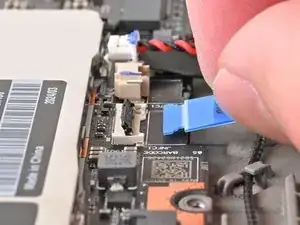Используйте чистый ноготь или плоский конец лопатки, чтобы приподнять запирающий язычок разъёма кабеля NFC, обозначенного «JNFC1».