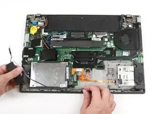 Пальцами снимите провод динамика с зажимов вдоль нижней части ноутбука.
