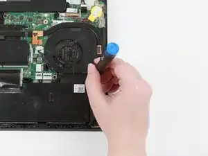 Снимите провод динамика с держателей вдоль нижней части ноутбука.