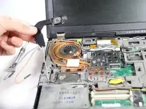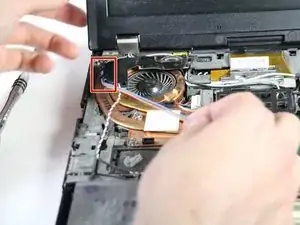 Хотя правый динамик отвинчен, его ещё нельзя извлечь из ноутбука!