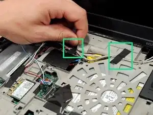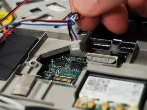 Теперь необходимо удалить соединитель проводов динамика с материнской платой.