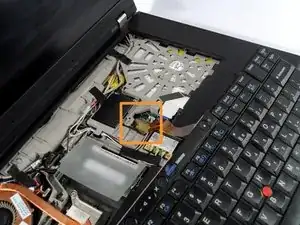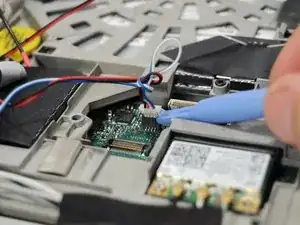 С помощью пластикового инструмента для открывания удалите соединительный шлейф клавиатуры с материнской платы.